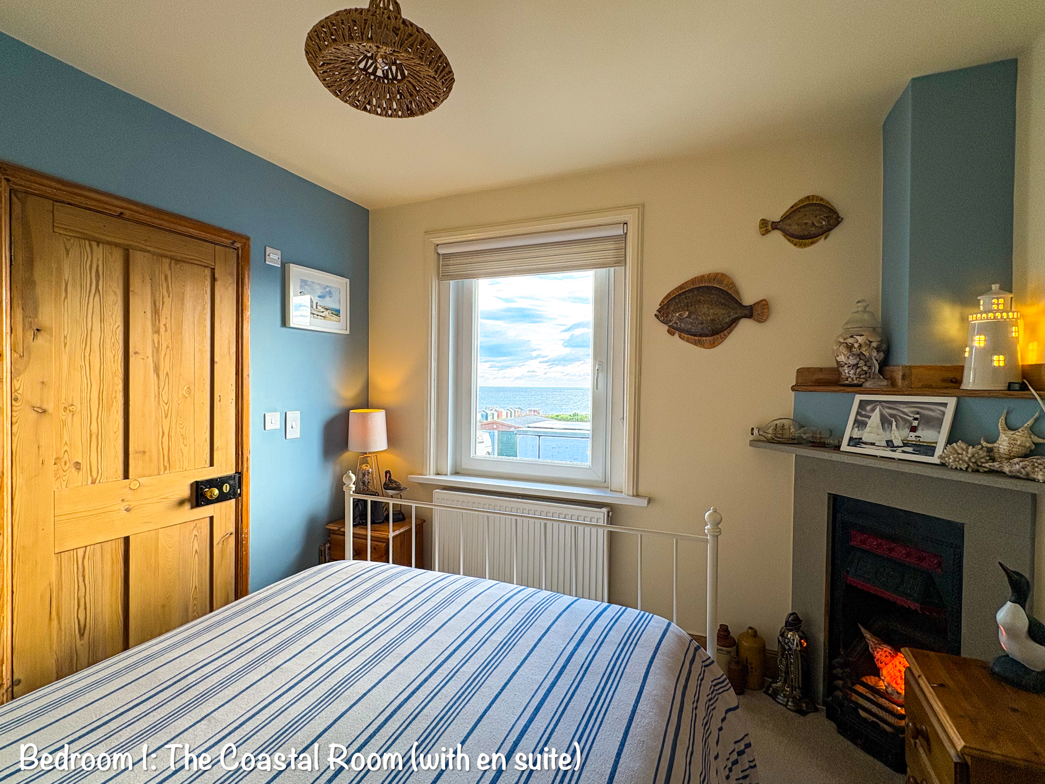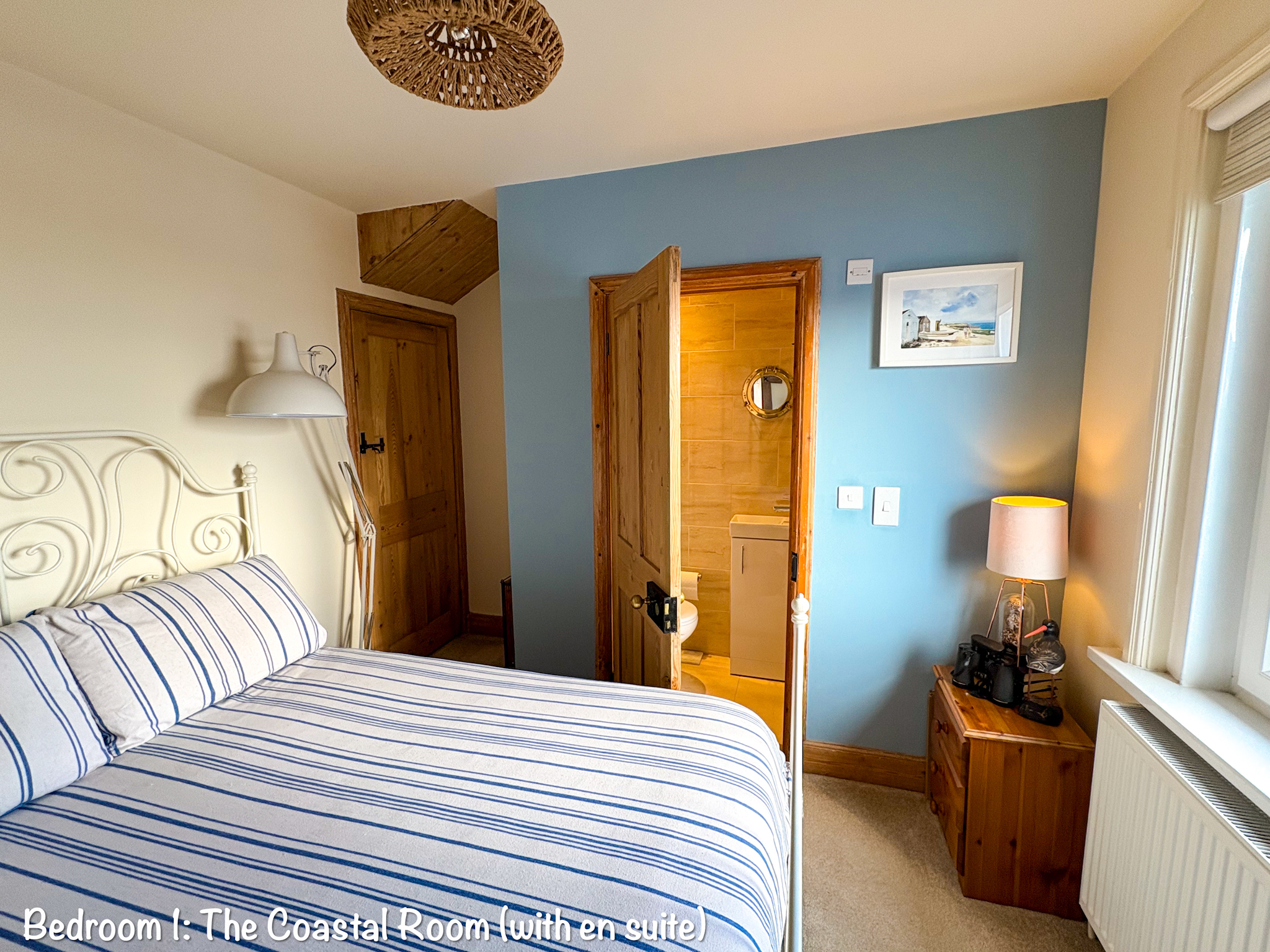The two double bedrooms are on the 1st floor. Bedroom 1 is a coastal view bedroom with direct southerly views over the sea, and a glimpse of the top of the lighthouse. This room has a double bed, plus a small ensuite toilet with small shower cubicle. The views from bed in the mornings can be stunning from this room, with the sun rising, and ships and sailing yachts going by.